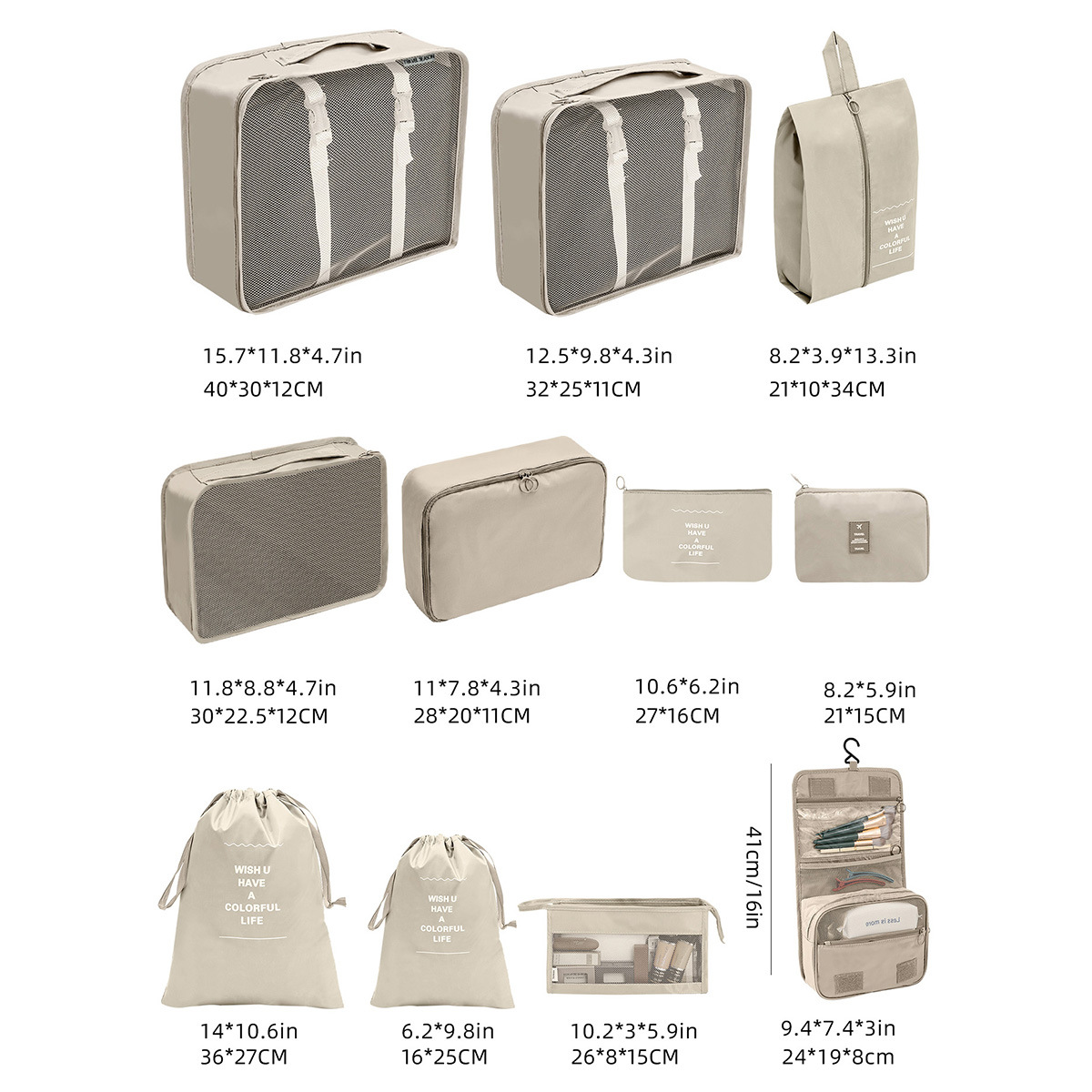 3.Function:There are three large, medium and small breathable mesh shoe bags, one compression bag, one digital bag, one large-sized cosmetic bag, one small-sized cosmetic bag, one toiletry bag, and two large and small-sized drawstring bags. total 11 bags.